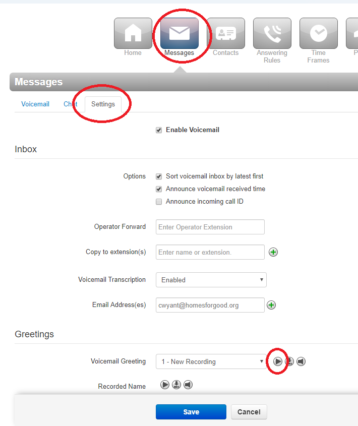 One of the first things you’ll want to do is record a voicemail greeting. Click the settings icon (gear/cog icon) and open the web portal. Go to Messages->Settings->Greetings and click the play button to record your voicemail greeting. Click Save when you’re finished.