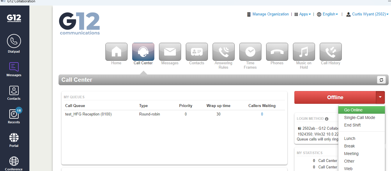 If you are a member of a workgroup (front desk reception, waitlist hotline, or work orders), you will access that function from the Portal button. Click Portal then click the Call Center button at the top. To start accepting workgroup calls, click the drop-down next to Offline and select “Go Online”. To sign out of the workgroup, select “Go Offline”.